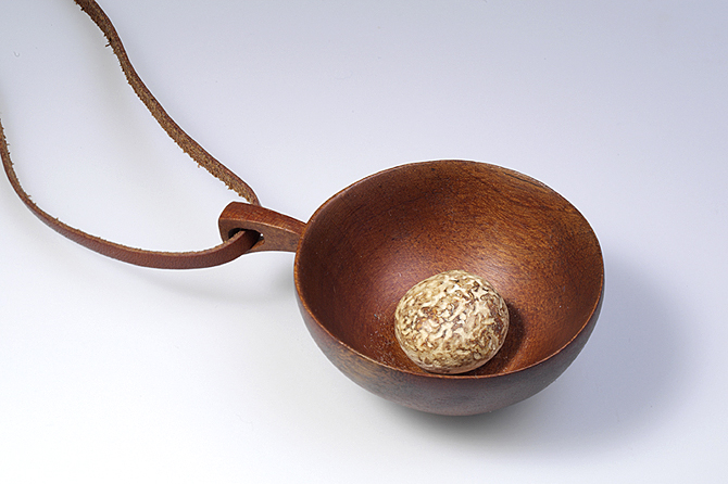 ořechové dřevo, kámen, kůže, d. 6,7 cm