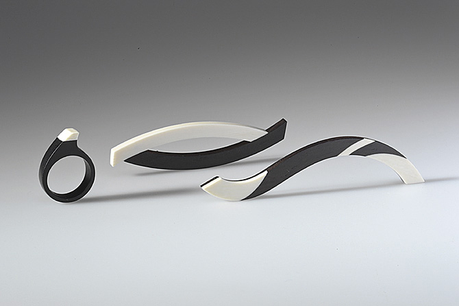 Dvě brože, 1987, eben, slonovina, nerez ocel, d. 8,9 cm, 10,8 cm