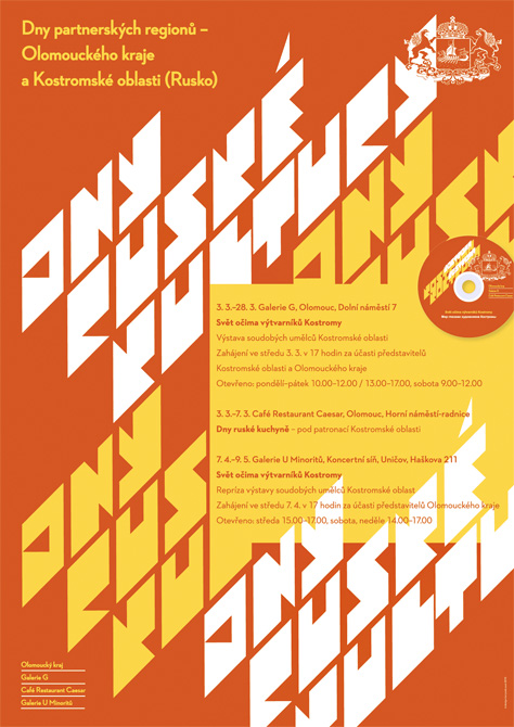 Vizuální styl Dnů ruské kultury, dny partnerských regionů — Olomouckého kraje a Kostromské oblasti (Rusko). Realizace (obr.) plakátu A1, CD katalogu "Svět očima výtvarníků Kostromy", pozvánky…